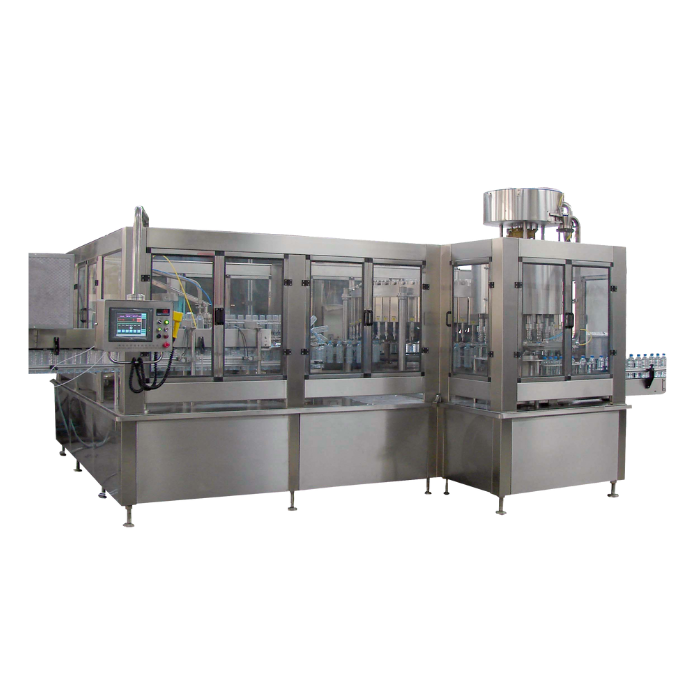DGY series rinser-filler-capper monobloc is an efficient automatic liquid packing machine that perfectly combines bottle rinsing machine, pressure filling machine and capping machine. Empty bottles are orderly fed into the rinsing machine by an air conveyor, and then are turned over and washed inside by the nozzles. After dripping, bottles are automatically sent to the filling machine for high quality and high speed filling. At last, the capper is used for safe and reliable capping of these bottles.